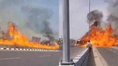 नेशनल हाईवे पर तेल टैंकर पलटा, 200 मीटर तक फैली भीषण आग