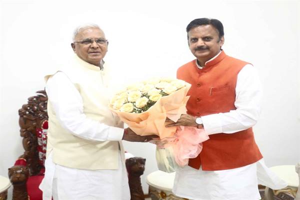 भोपाल : राज्यपाल मंगुभाई पटेल से उप-मुख्यमंत्री राजेन्द्र शुक्ल ने मंगलवार को राजभवन में सौजन्य भेंट की। राज्यपाल पटेल का उप मुख्यमंत्री शुक्ल ने पुष्पगुच्छ भेंट कर अभिनंदन किया। राज्यपाल पटेल से उप मुख्यमंत्री शुक्ल ने प्रदेश के विकास संबंधी विभिन्न विषयों पर औपचारिक चर्चा की।