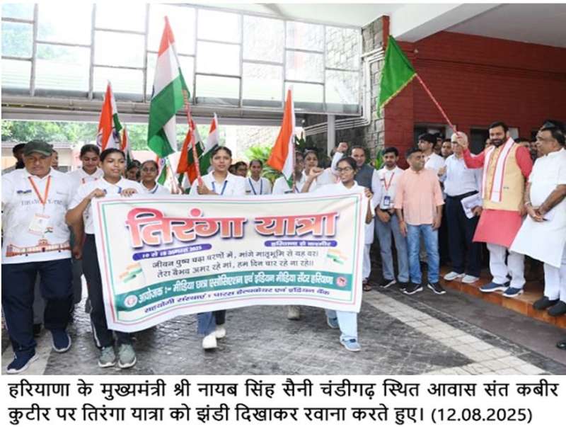 चंडीगढ़: हरियाणा के मुख्यमंत्री नायब सिंह सैनी ने मंगलवार को चंडीगढ़ से ‘तिरंगा यात्रा’ को हरी झंडी दिखाकर रवाना किया, यह यात्रा पंजाब से होते हुए कश्मीर के ऐतिहासिक लाल चौक तक जाएगी। मीडिया छात्र संघ की ओर से आयोजित की गई यह यात्रा 18 अगस्त को समाप्त होगी। मुख्यमंत्री नायब सिंह सैनी ने सोसिएशन के पदाधिकारियों और सदस्यों, विशेषकर यात्रा में भाग लेने वाली 100 से अधिक छात्राओं को बधाई दी। इस पूरी यात्रा का नेतृत्व और प्रबंधन छात्राओं द्वारा किया जा रहा है।