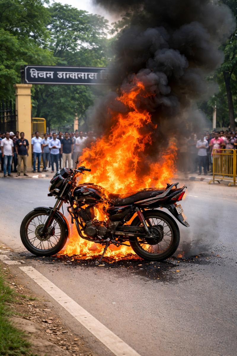 जिला न्यायालय के पास चलती बाइक बनी आग का गोला, मचा हड़कंप