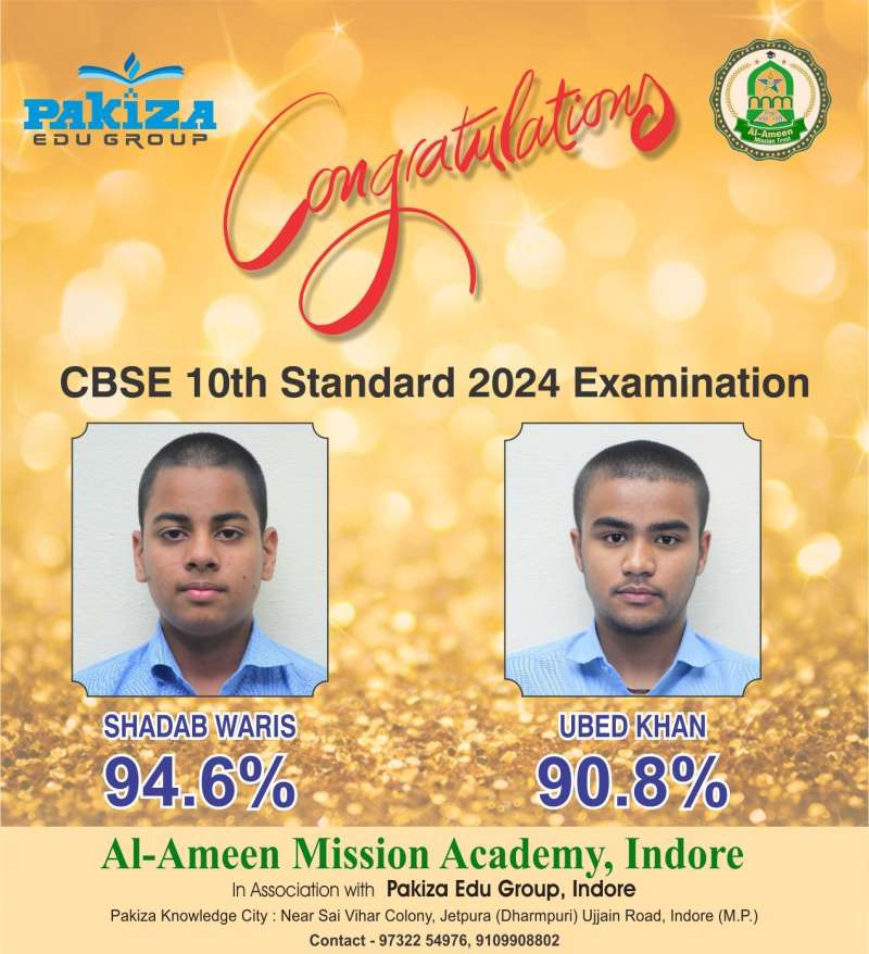 इंदौर की प्रतिष्ठित बकिजा पब्लिक स्कूल में सीबीएसई एग्जाम में काफी अच्छा प्रदर्शन किया है स्कूल के दो छात्रों है तो 90 और 94 से अधिक प्रतिशत प्राप्त कर स्कूल को गौरवान्वित किया है स्कूल के ज्यादातर छात्रों ने 90% से ज्यादा अंक प्राप्त किए हैं पाकीजा पब्लिक स्कूल जेतपुरा इंदौर का कक्षा दसवीं सी.बी. एस. ई. का परीक्षा परिणाम शत प्रतिशत रहा । छात्र शादाब वारिस ने 94.6 % प्राप्त करके स्कूल में प्रथम स्थान प्राप्त किया । वही एक अन्य छात्र उबेद खान ने 90.8% प्राप्त किए। कुल 54 छात्र छात्राओं में 2 छात्रों ने 90 प्रतिशत से अधिक 10 छात्रों ने 80 प्रतिशत से अधिक तथा 8 छात्रों ने 70 प्रतिशत से अधिक अंक हासिल करके स्कूल का नाम रौशन किया । संस्था अध्यक्ष जनाब मकसूद गौरी सर, वाइस चेयरमैन नदीम मुल्तानी , सी.जी.एम. अता ,एडमिनिस्ट्रेटिव ऑफिसर सरफराज सर और प्रिंसिपल ख्याति जैन ने हर्ष व्यक्त किया और छात्र - छात्राओं के उज्जवल भविष्य के लिए शुभकामनाएं दी ।